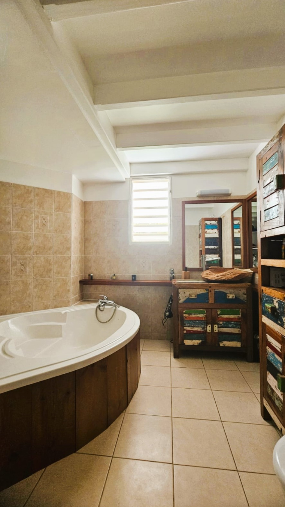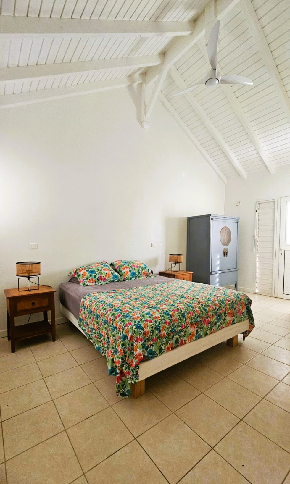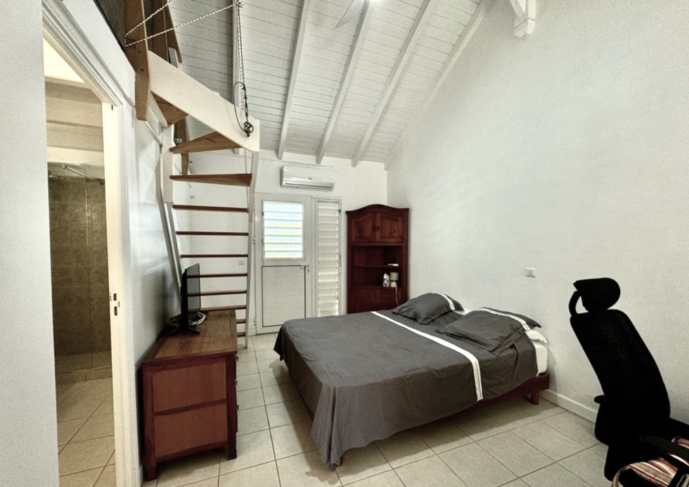 Charme et harmonie décrive parfaitement la villa principale qui propose un confort absolu, des finitions soignées et de belles hauteurs sous plafond grâce à sa charpente apparente typique des Antilles : 2 suites parentales spacieuses disposant chacune sa salle d'eau/WC et de son dressing (l'une des 2 est améliorée d'une mezzanine), une entrée aérée qui sépare le coin nuit de la pièce de vie, un WC indépendant, un débarras pratique et un séjour lumineux avec cuisine américaine équipée, l'ensemble ouvert sur la terrasse et le jardin tropical où règne une végétation des plus diversifiéé.