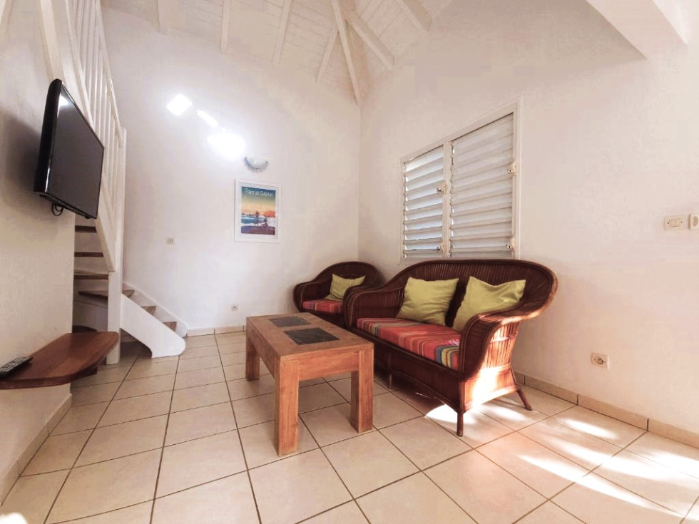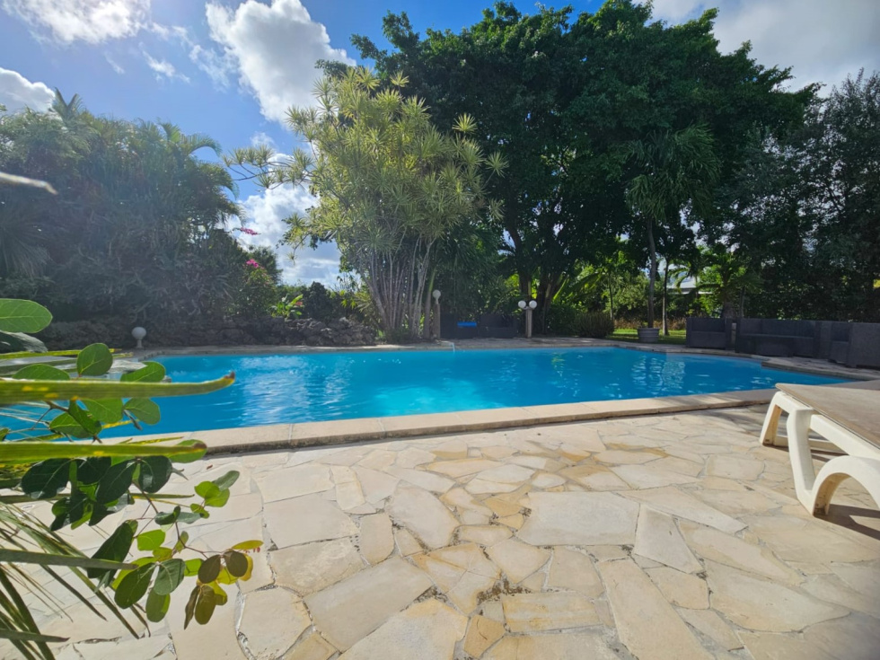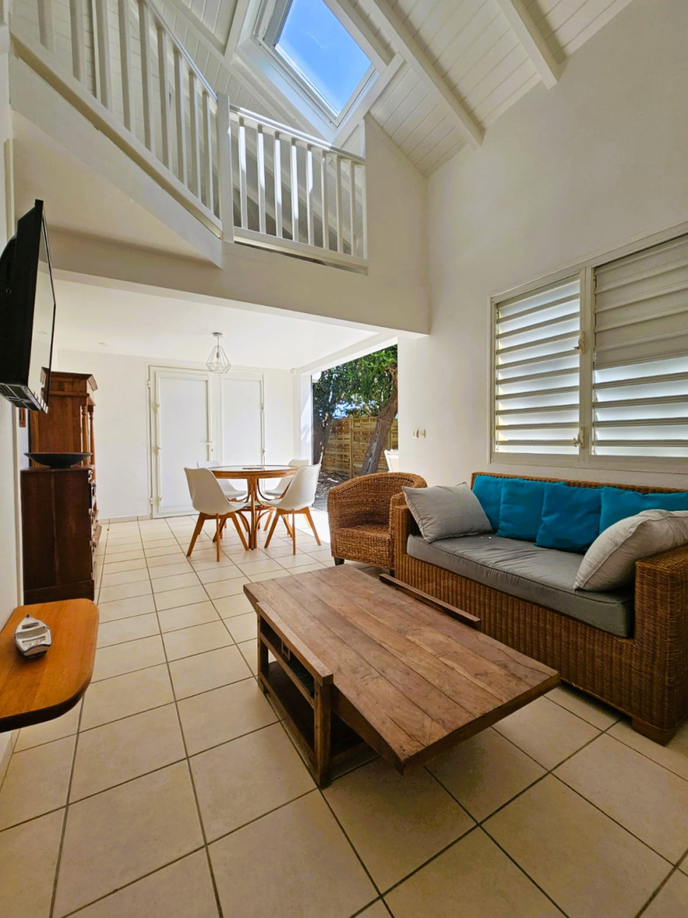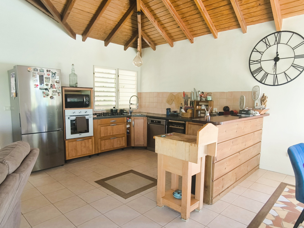 Charme et harmonie décrive parfaitement la villa principale qui propose un confort absolu, des finitions soignées et de belles hauteurs sous plafond grâce à sa charpente apparente typique des Antilles : 2 suites parentales spacieuses disposant chacune sa salle d'eau/WC et de son dressing (l'une des 2 est améliorée d'une mezzanine), une entrée aérée qui sépare le coin nuit de la pièce de vie, un WC indépendant, un débarras pratique et un séjour lumineux avec cuisine américaine équipée, l'ensemble ouvert sur la terrasse et le jardin tropical où règne une végétation des plus diversifiéé.