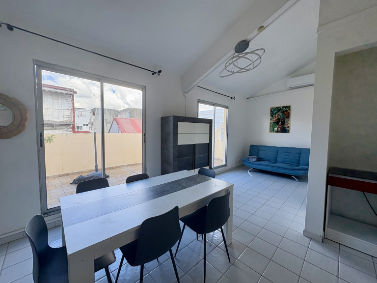 Situé proche du centre ville de Pointe à Pitre, à deux pas du marché aux épices, de la place de la Victoire et de la Darse, venez visiter cet appartement T2 meublé de 40,66 m2 situé au 3ème et dernier étage d’un immeuble sécurisé. Il se compose d’un séjour lumineux avec une kitchenette avec lave vaisselle, four et micro-ondes, un coin salon climatisé, une chambre climatisée, une salle d’eau avec un WC, une belle terrasse.