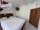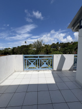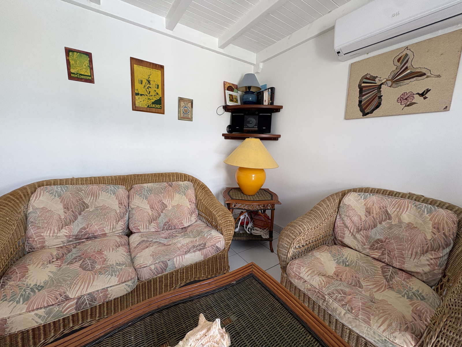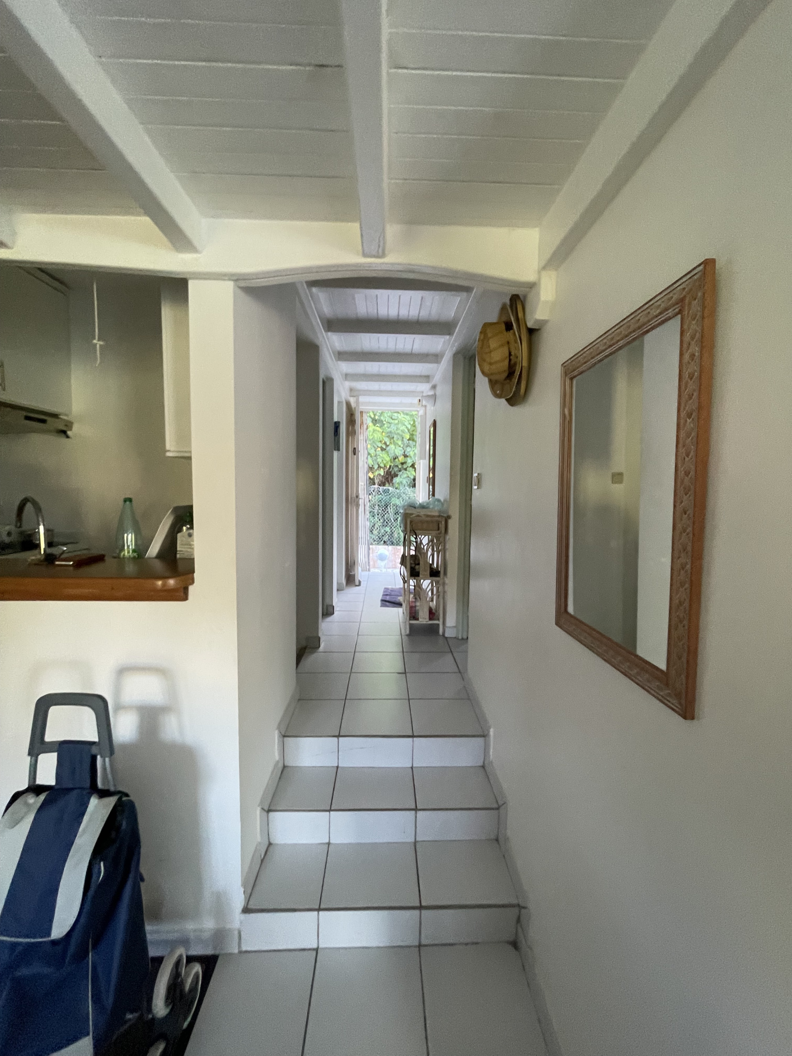 En arrivant à l'appartement vous découvrirez une entrée donnant accès à la salle à manger lumineuse, une terrasse avec une vue sur la mer, la chaine de montagne de Basse-Terre et la nature, une cuisine équipée (plaque, lave vaisselle, micro-ondes...), un séjour, une chambre avec placard, une salle d'eau, un WC indépendant. A l'étage, une chambre, un espace bureau.