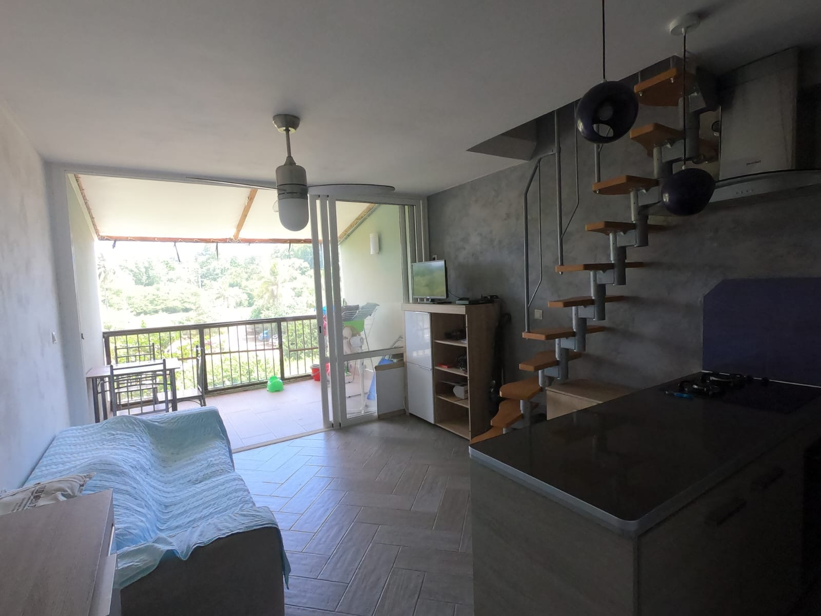 Il se compose d'une entrée avec rangement, une cuisine équipée ouverte sur le séjour, une salle d'eau avec WC et une terrasse d'environ 10m2. A l'étage, deux chambres climatisées et équipées de rangement.