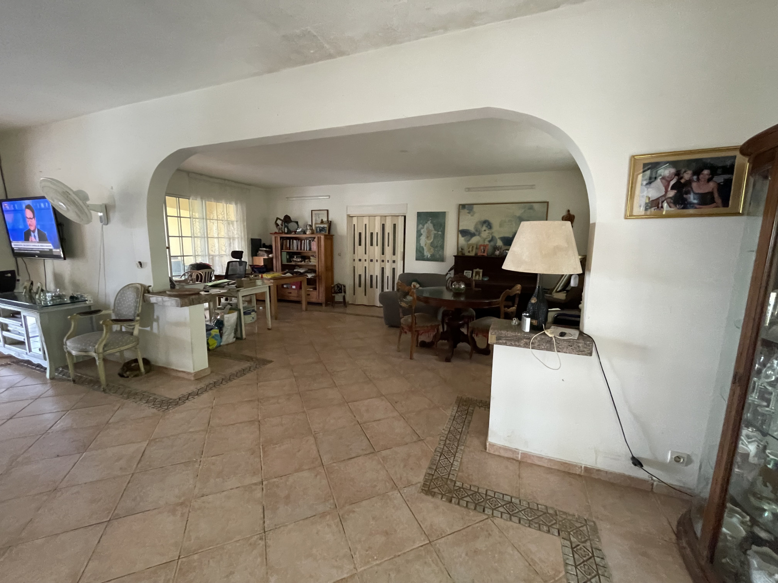 Au rez-de-chaussée, une cuisine, un double séjour d'environ 59m2 donnant sur une autre terrasse avec vue sur la piscine à rénover, trois chambres ayant chacune sa salle de bain ou salle d'eau.