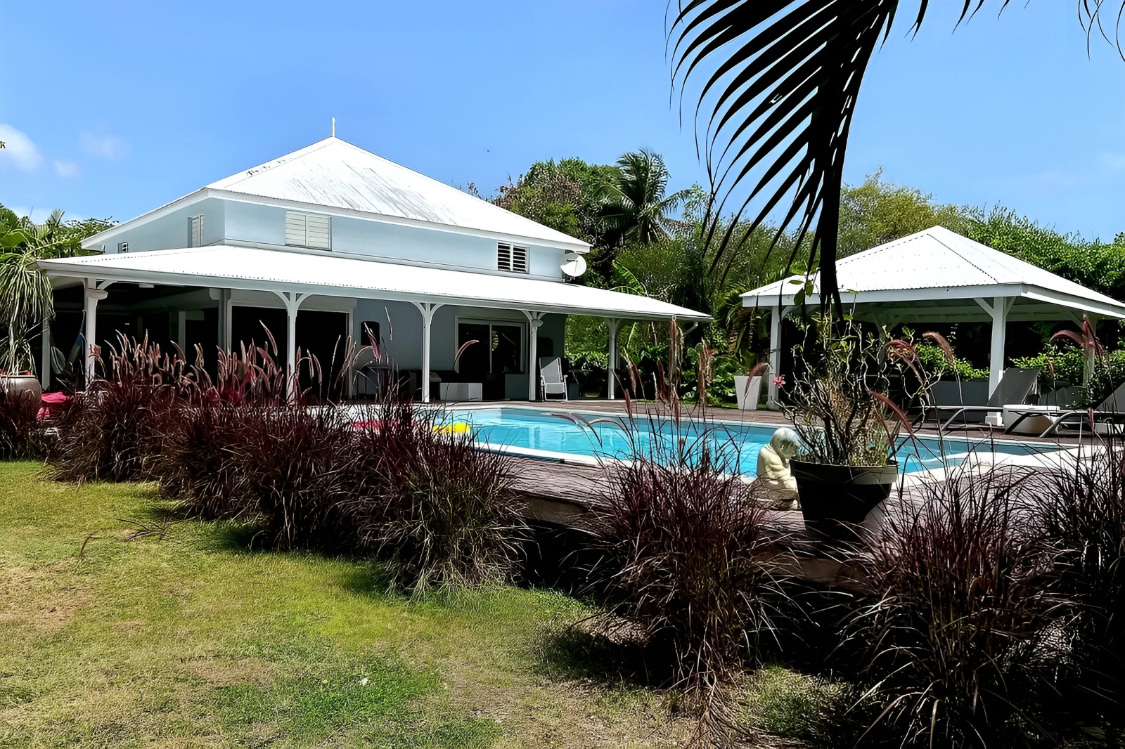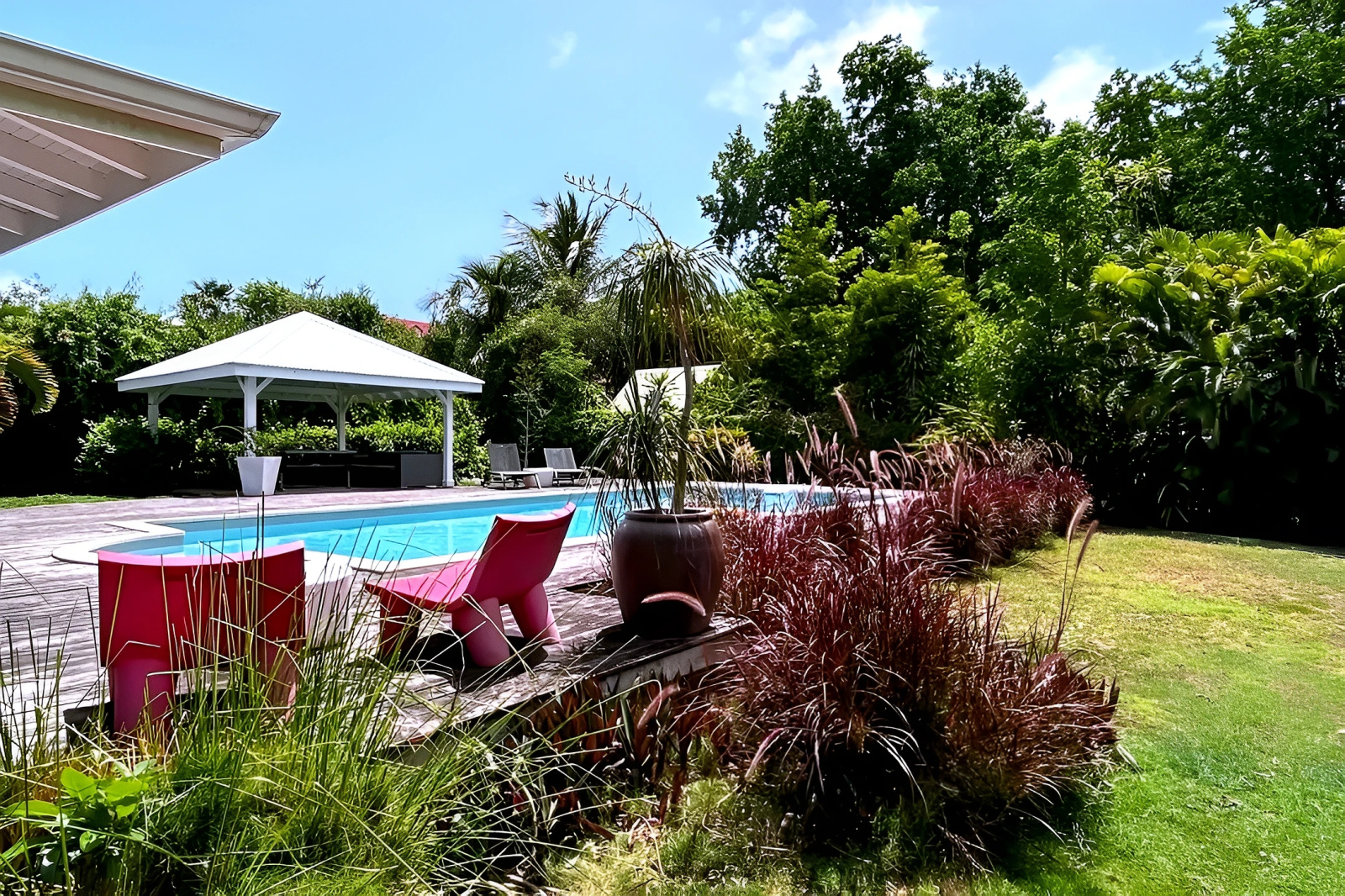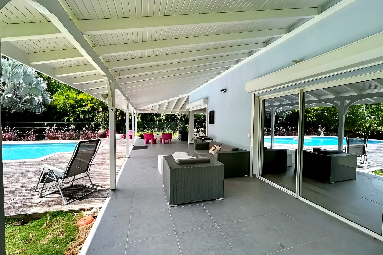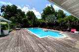 La grande terrasse en L,embellit d'un bassin esprit Balinais et prolongée d'une plage de deck à ciel ouvert et d'un carbet. Idéale pour profiter pleinement de moments inoubliables entre amis ou en famille.