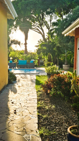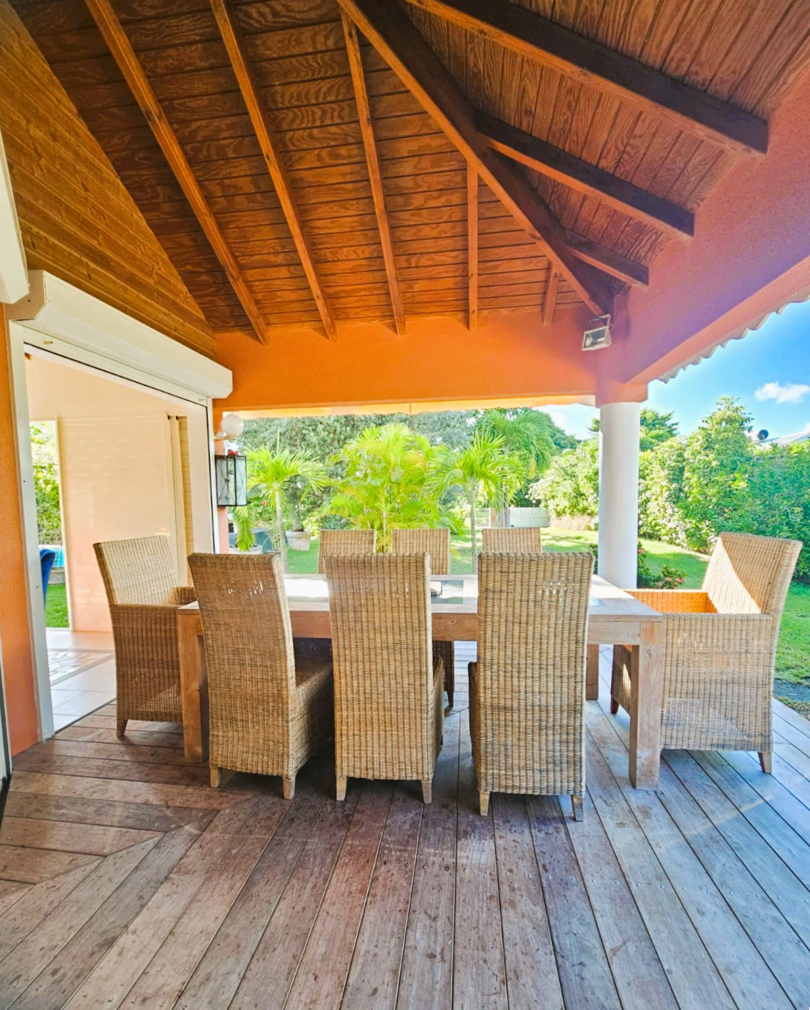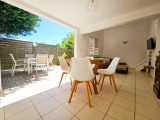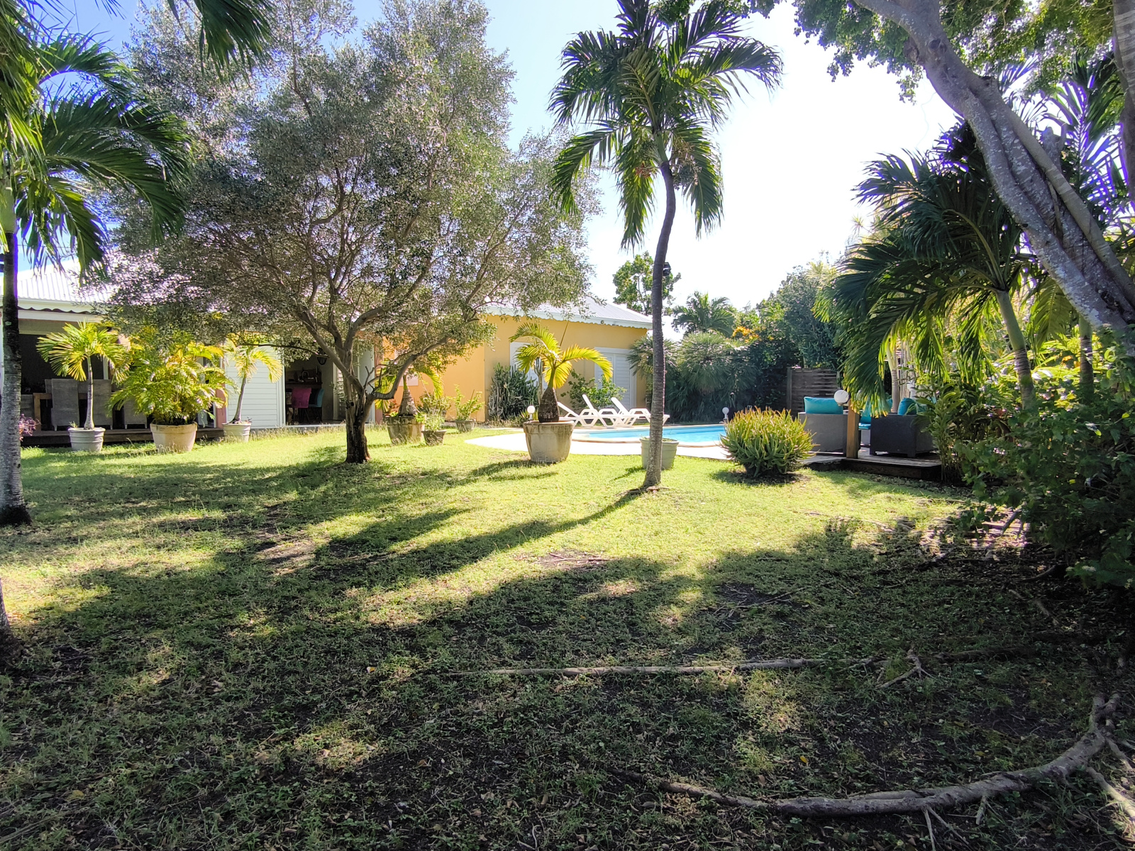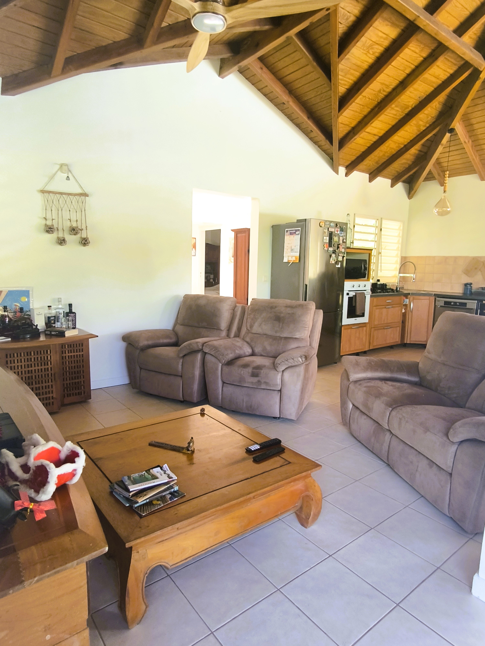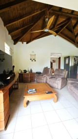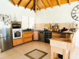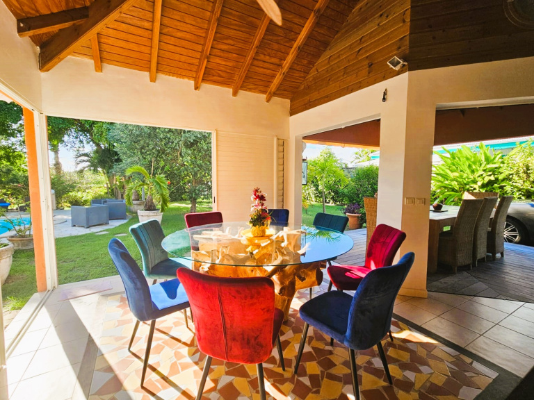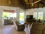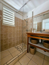 Charme et harmonie décrive parfaitement la villa principale qui propose un confort absolu, des finitions soignées et de belles hauteurs sous plafond grâce à sa charpente apparente typique des Antilles : 2 suites parentales spacieuses disposant chacune sa salle d'eau/WC et de son dressing (l'une des 2 est améliorée d'une mezzanine), une entrée aérée qui sépare le coin nuit de la pièce de vie, un WC indépendant, un débarras pratique et un séjour lumineux avec cuisine américaine équipée, l'ensemble ouvert sur la terrasse et le jardin tropical où règne une végétation des plus diversifiéé.