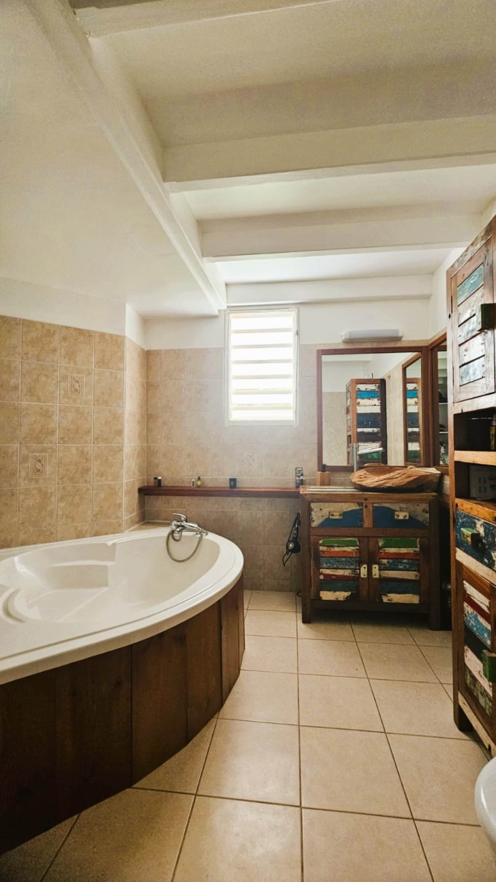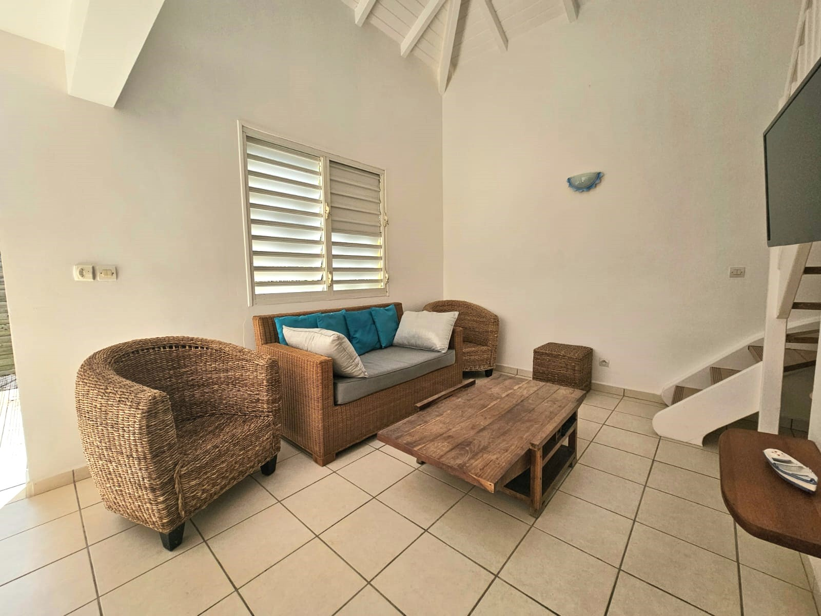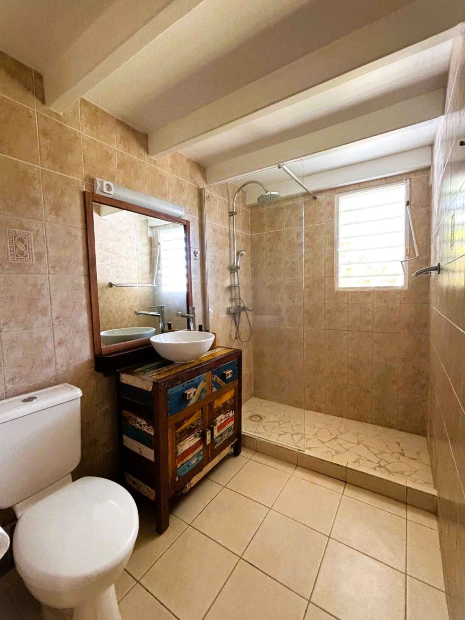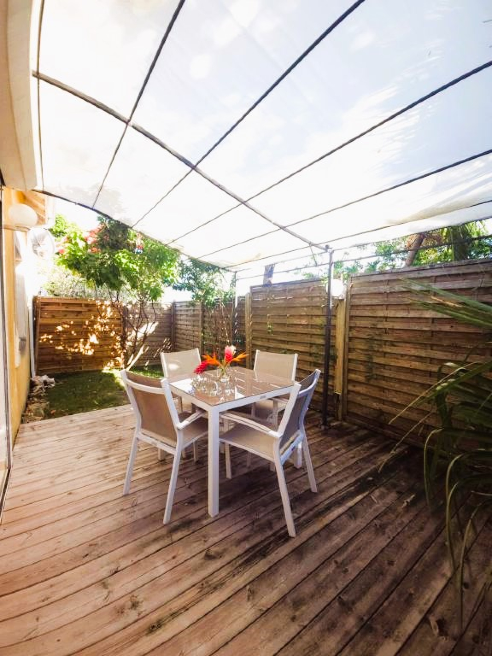 Charme et harmonie décrive parfaitement la villa principale qui propose un confort absolu, des finitions soignées et de belles hauteurs sous plafond grâce à sa charpente apparente typique des Antilles : 2 suites parentales spacieuses disposant chacune sa salle d'eau/WC et de son dressing (l'une des 2 est améliorée d'une mezzanine), une entrée aérée qui sépare le coin nuit de la pièce de vie, un WC indépendant, un débarras pratique et un séjour lumineux avec cuisine américaine équipée, l'ensemble ouvert sur la terrasse et le jardin tropical où règne une végétation des plus diversifiéé.
